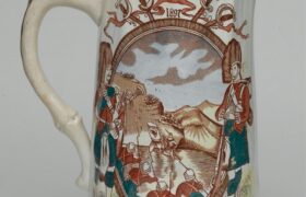 په دې انځور کې د چیني خاورې په یو جګ د ۱۸۹۷م نېټه او ”درګۍ” لیکلی ښکاري. ورسره په رنګین نقش کې د پښتونخوا غرونه او په تاو راتاو لارو په زرګونو پښتانه قبایل لیدای شي. څلوروانګریز عسکرو ته مخامخ یو جنګیالي لویه تیږه په دواړو لاسونو کې سر د پاسه نیولی، په پوره […]