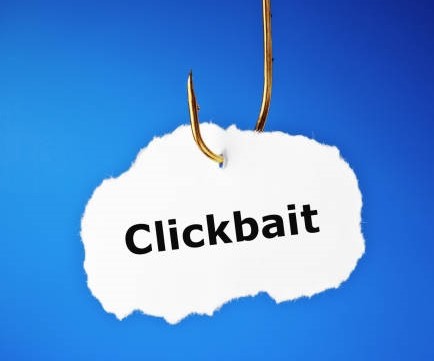 Printed word Clickbait hanging on a fishing hook. Concept about the misleading advertisements designed to attract attention and entice users to follow the linked piece of online content.